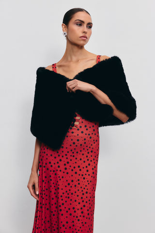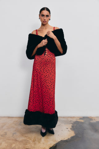 Rounded shoulders, double-breasted collars, voluminous skirts, bow accents, nostalgic polka dots, and soft faux-fur touches… Each piece bridges the classic refinement of the 1950s with the aesthetic codes of today.