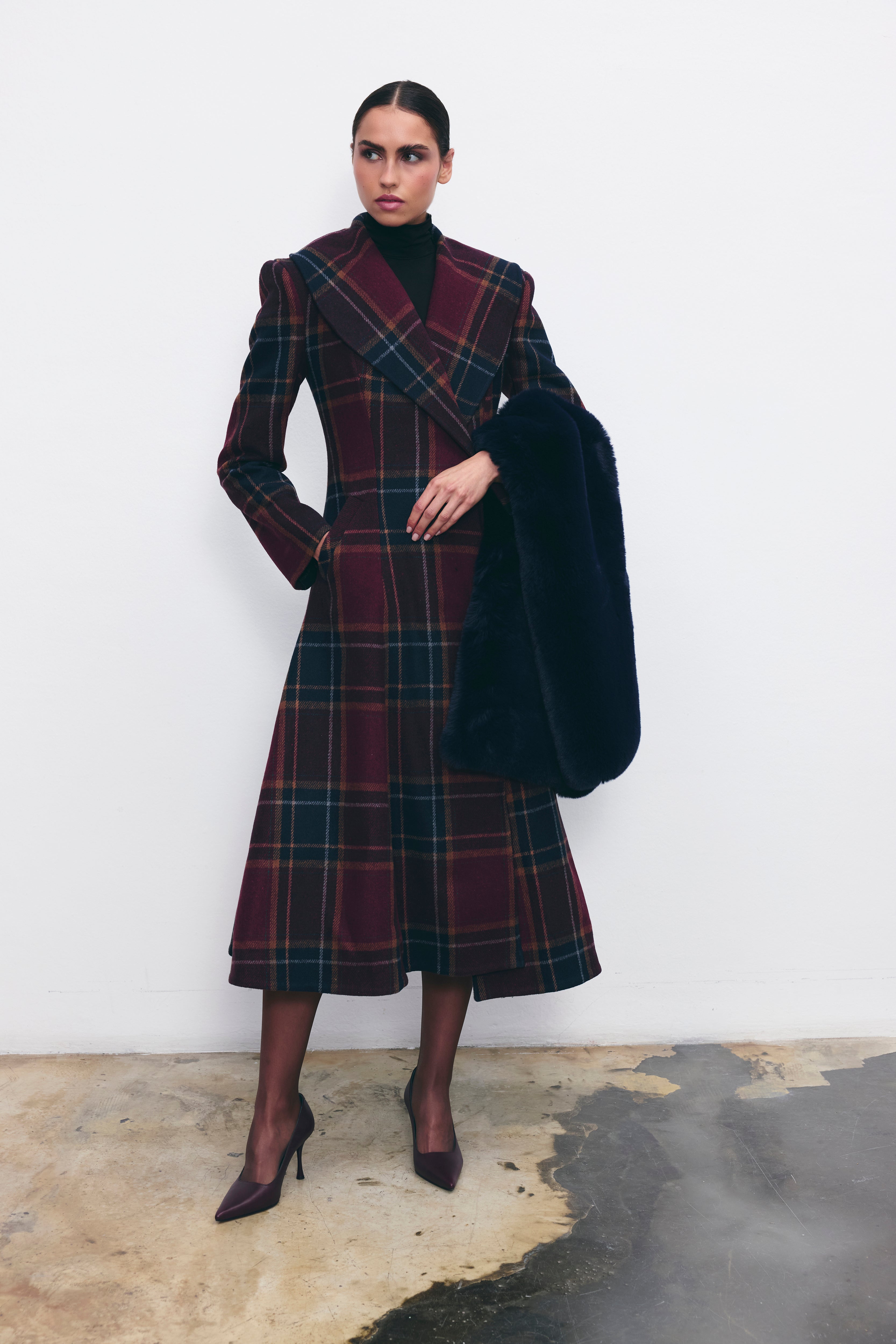 Defined by its strong silhouette and timeless plaid, the Estelle Coat brings elegance and warmth together. Designed in a flattering fit-and-flare cut, this midi-length piece gently hugs the waist with a belted finish—ideal for both city style and special occasions. Its wool-blend texture offers elevated comfort through cooler days.