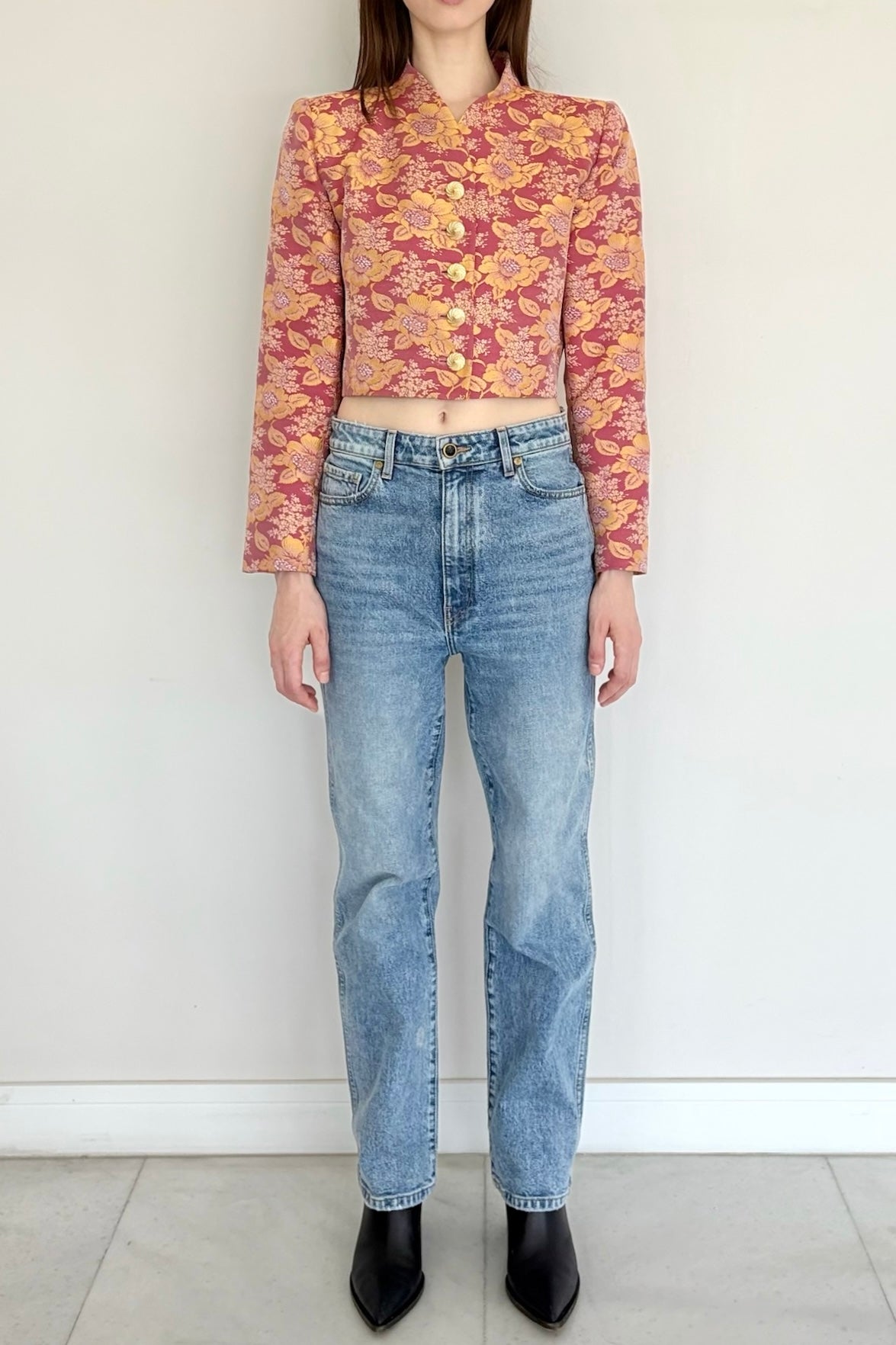 This vintage Yves Saint Laurent blazer reflects the house’s iconic power silhouette with its strong shoulders and rich jacquard fabric. A timeless piece that channels 80s elegance, ideal for both structured daytime looks and elevated evening wear. Size M.
