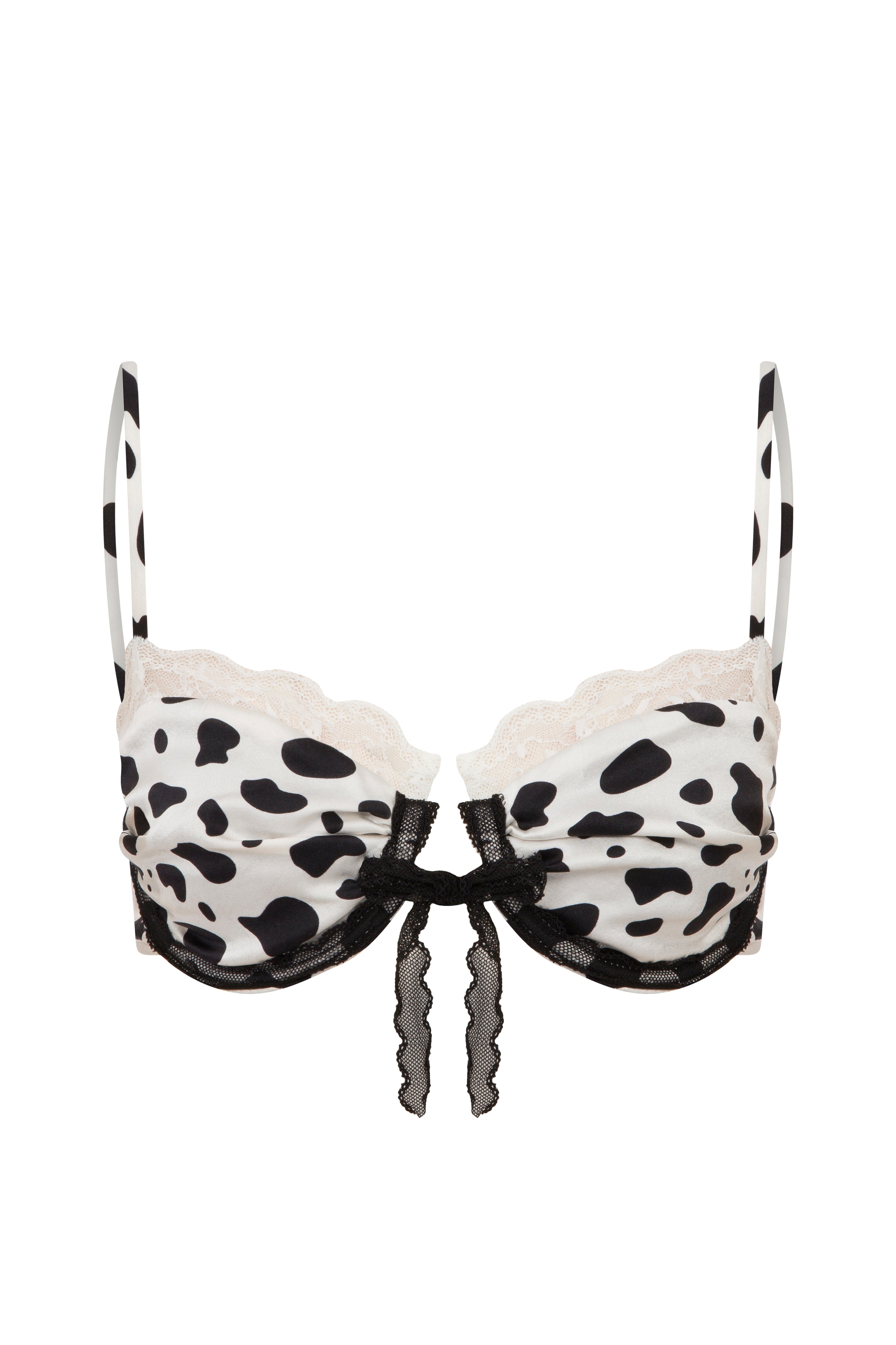 Striking and feminine, this 100% silk satin bralette features an eye-catching black and white Dalmatian print, elevated with playful ruffled lace trims.