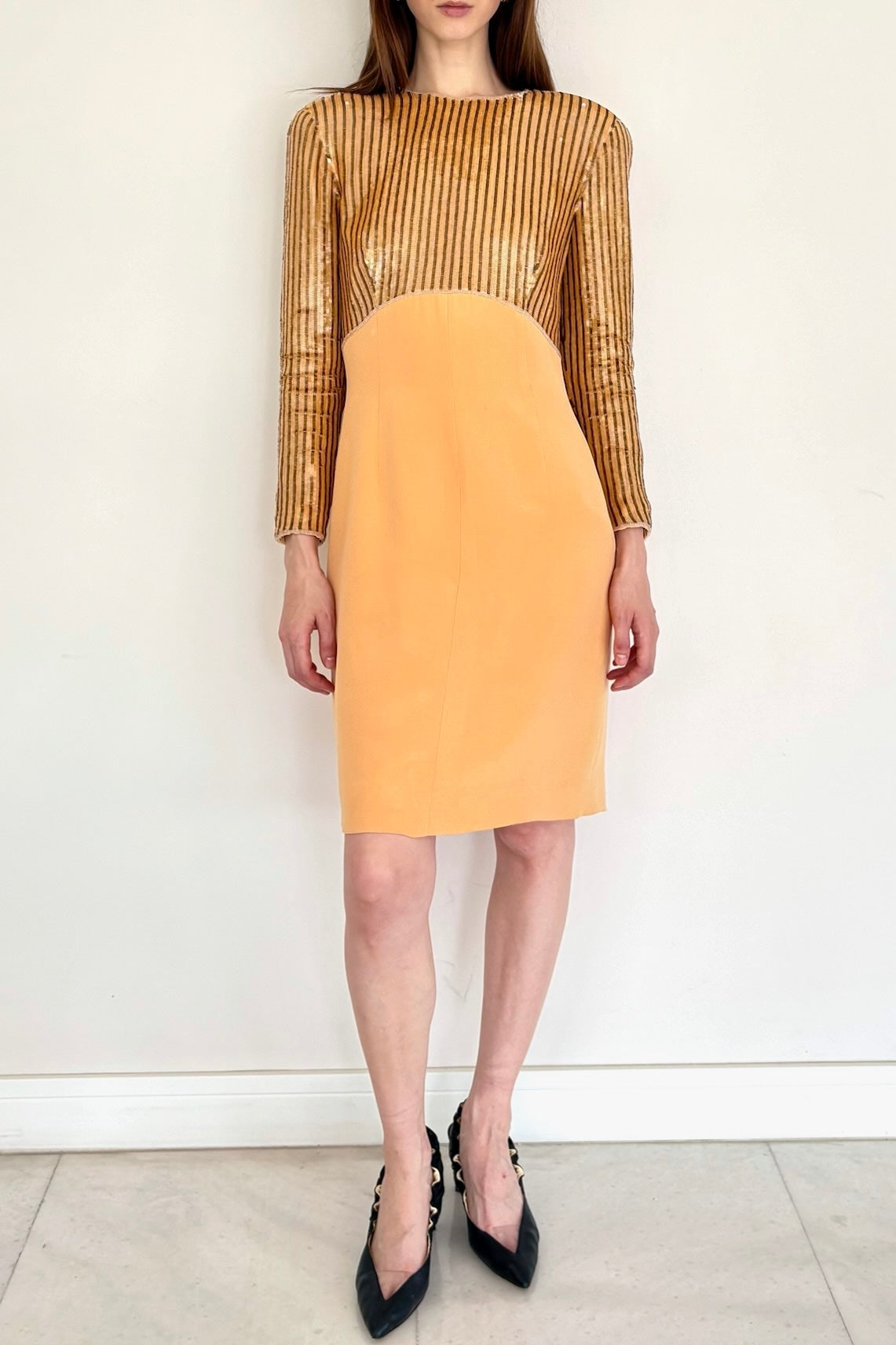 Glamorous and fluid, with full silk lining and sequin work. Size 36