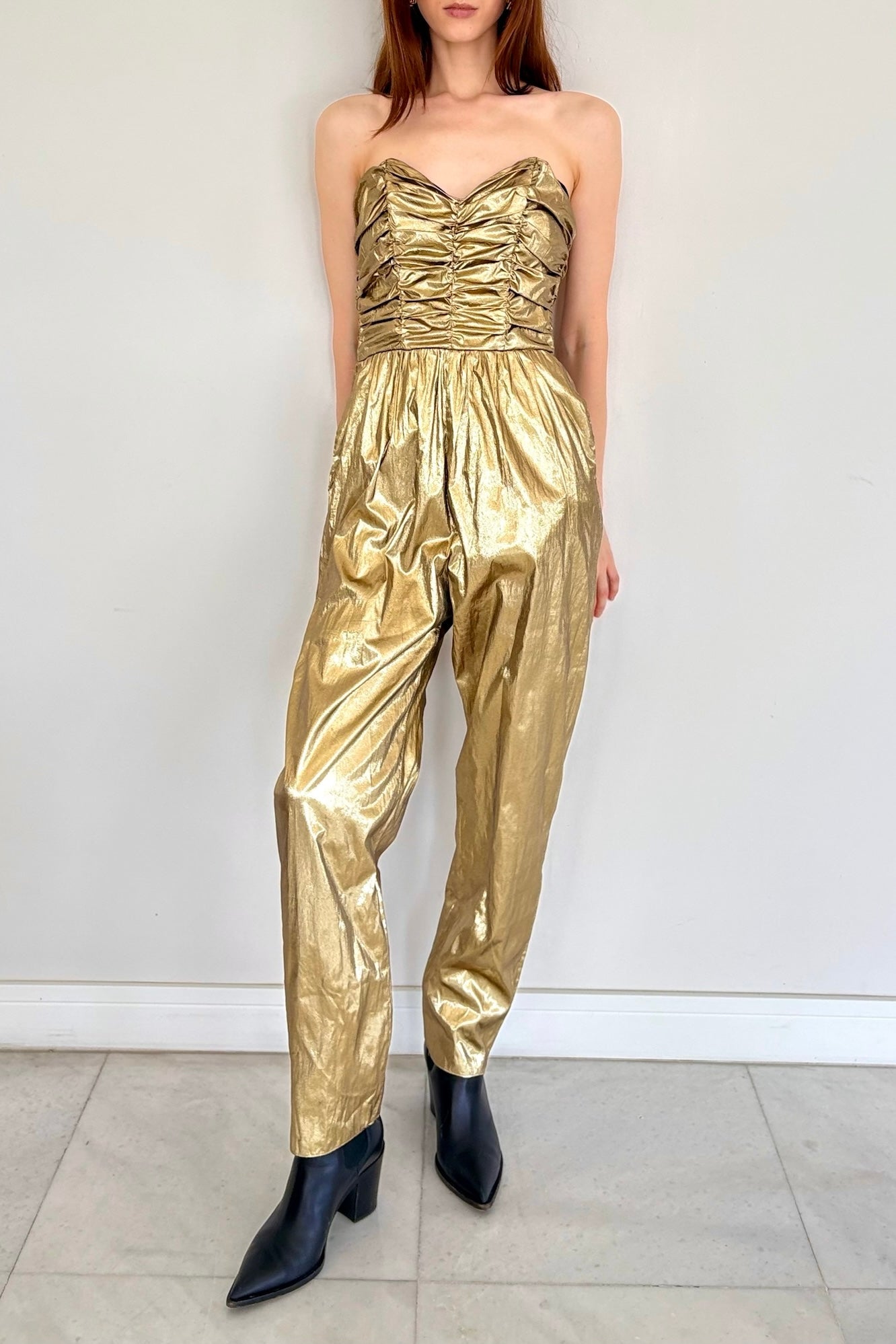 With its metallic gold fabric and sweetheart neckline bodice, this vintage jumpsuit delivers a powerful silhouette and a dramatic presence. Inspired by the bold elegance of the 1980s, its body-hugging shape makes it a true statement piece for unforgettable nights.