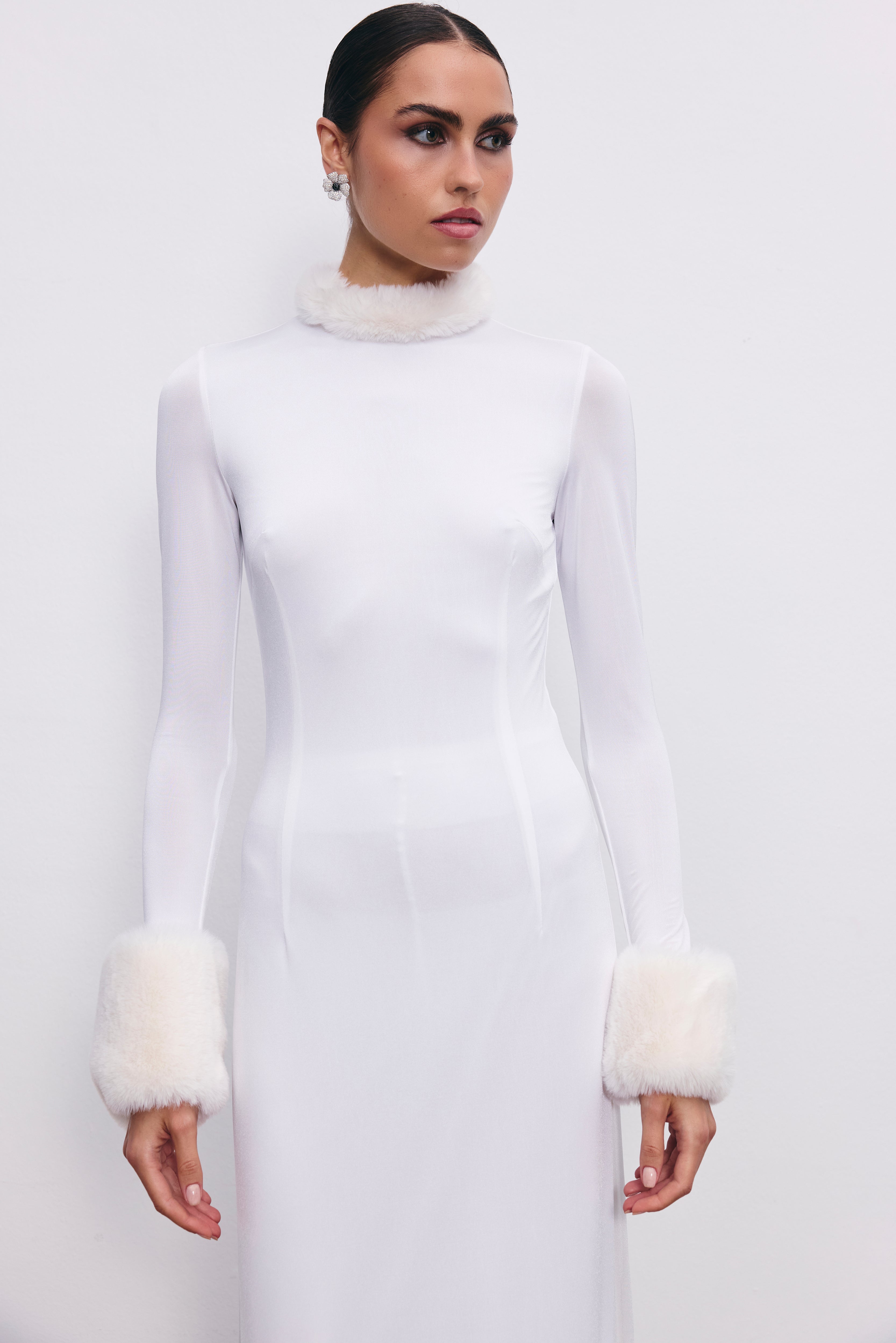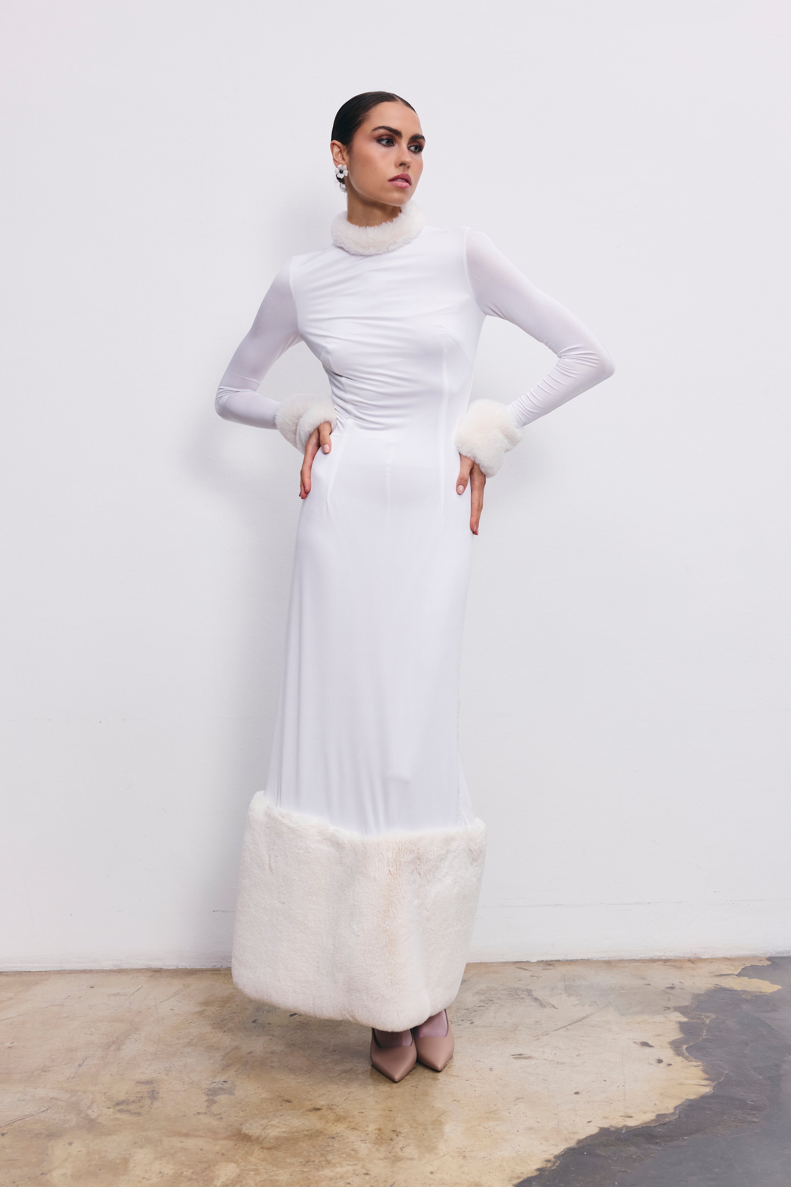 BELLA FAUX-FUR TRIM MAXI JERSEY DRESS