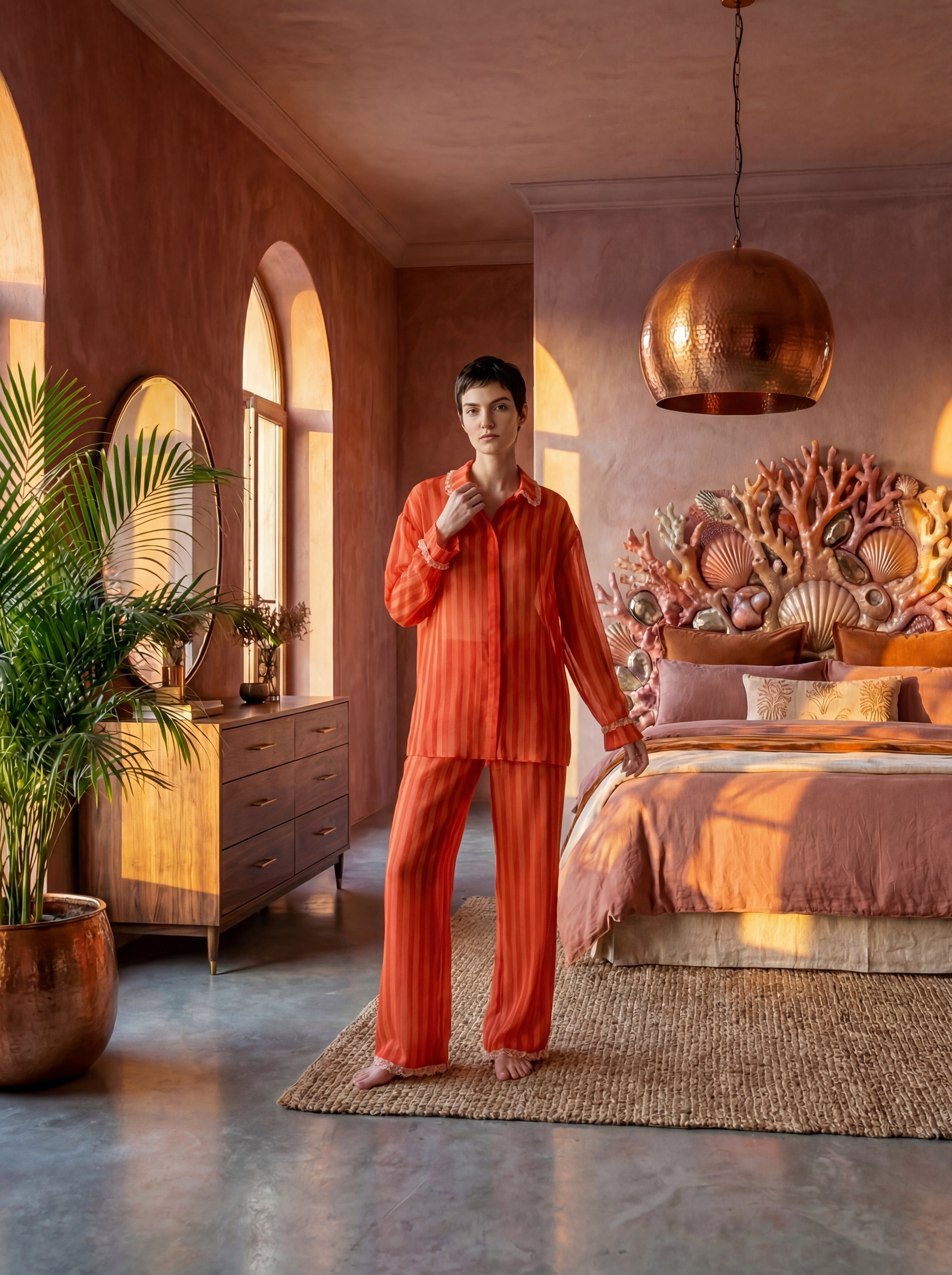 The nostalgic charm of striped fabric in vibrant orange tones meets delicate frilled lace at the collar, cuffs, and hems. Offering a cheerful and romantic sleepwear style, this set also provides the comfort you deserve at the end of the day with its relaxed fit.